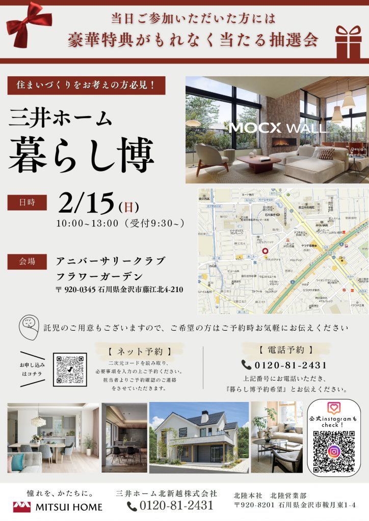 出展社 2026-01-16 【三井ホーム】2月15日 家づくりがまるわかり「暮らし博」inフラワーガーデン #三井ホーム こんにちは! 今年も大人気イベント「暮らし博」を開催いたします♪ お住まいづくりを考え始めの方、メーカー選びでお悩みの方におすすめです! 皆さまのご参加を心よりお待ちしております! 前の記事へ ⼀覧へ戻る 次の記事へ