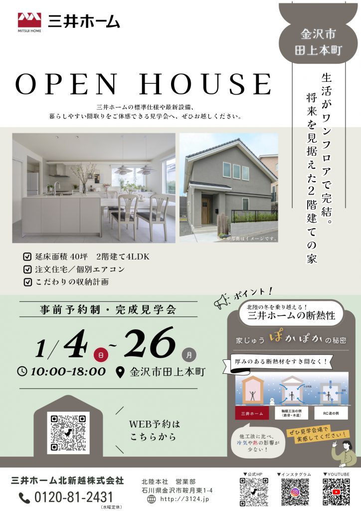 出展社 2025-12-26 【三井ホーム】1月4日~26日 新年初完成見学会in金沢市🌙 #三井ホーム こんにちは! 2026年1発目の見学会です♪ 三井ホームのあたたかいすまいをぜひ感じてください! お問合せ方法*完全予約制 ➀HPより予約(以下リンクをクリックし、お進みください!) 【金沢市田上本町】将来を見据えた2階建てのお住まい 完成見学会 ②0120-81-2431 にお電話〈受付時間 9:00~18:00 (水曜日定休)〉 ※ご予約いただきましたら営業担当から日程確定のご連絡を致します。 ※予約状況によってはご希望に沿えない場合がございます。 前の記事へ ⼀覧へ戻る 次の記事へ